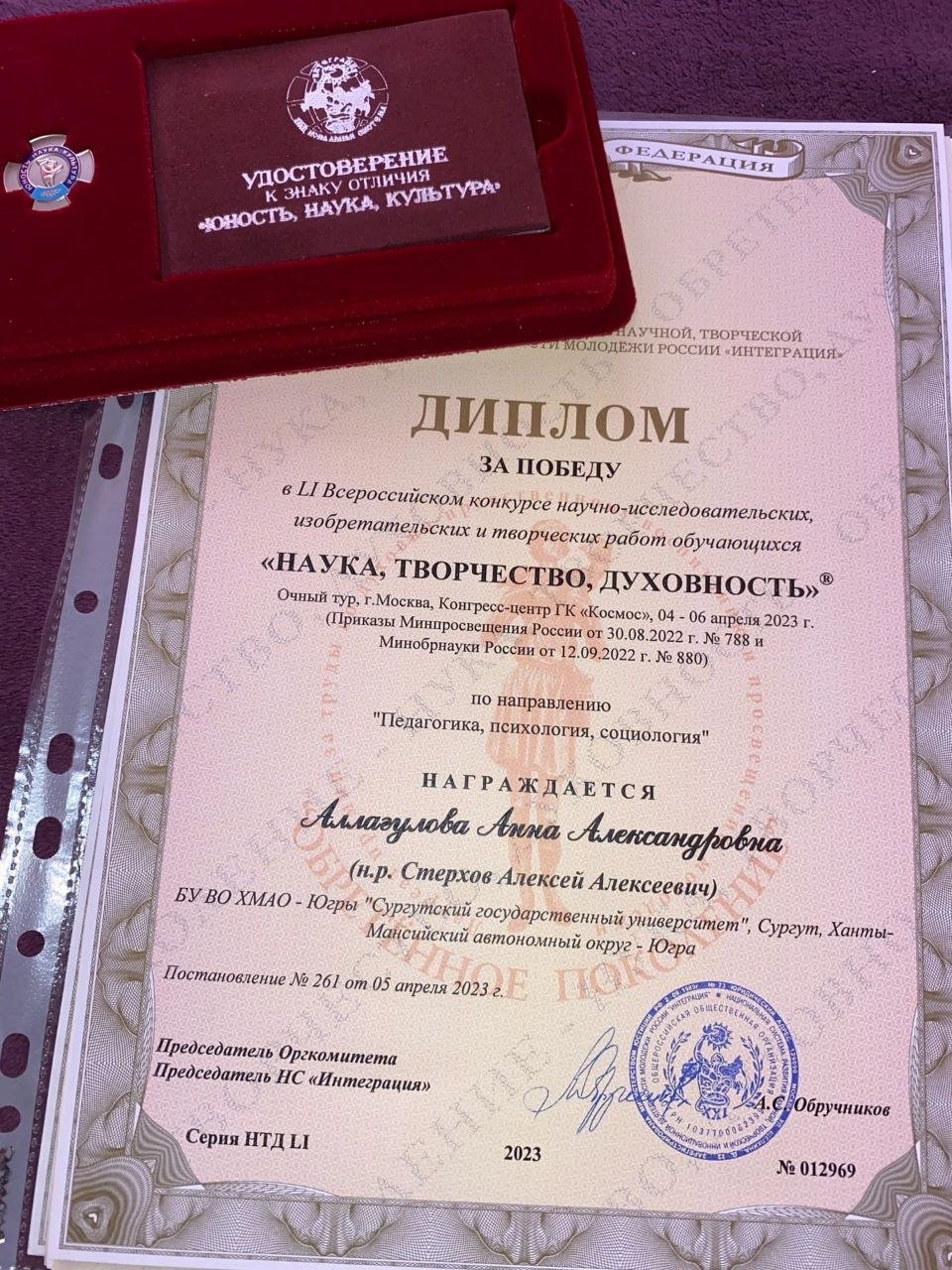 Студентка второго курса Института гуманитарного образования и спорта Анна Аллагулова стала победителем Всероссийского конкурса научно-исследовательских, изобретательских и творческих работ обучающихся «Наука, творчество, духовность», организованного общественной организацией «Национальная система ‟Интеграция”». Анна выступала в направлении «Педагогика, психология, социология», представляя свою работу «Моделирование системы персонализации образовательной деятельности».