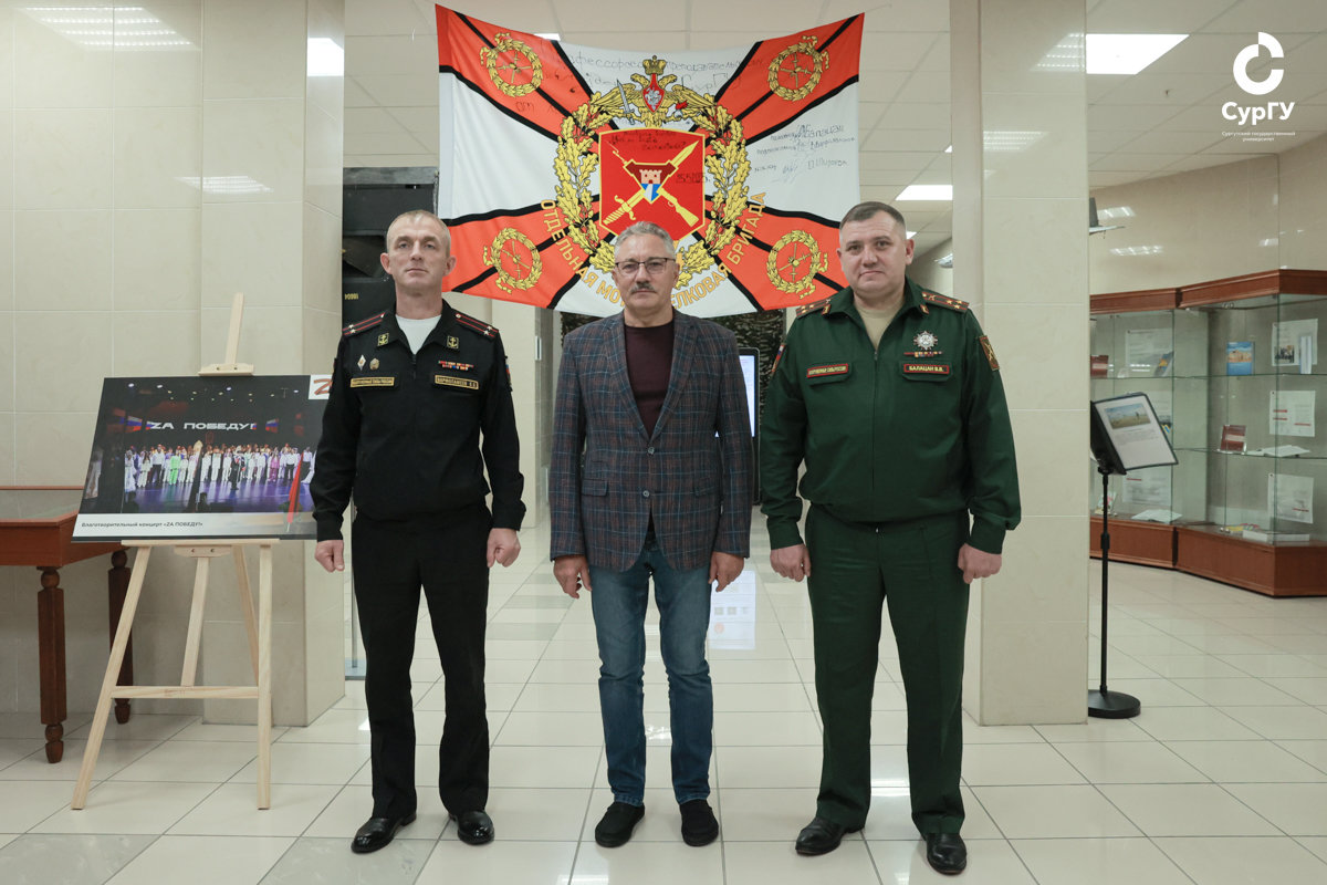 Ректор Сургутского госуниверситета Сергей Косенок и руководитель Музея СурГУ, хранитель музейных предметов Даниил Бауман представили полковнику Виктору Балацану экспозицию «Вызов времени», свидетельствующую о мужестве и отваге участников специальной военной операции. Выставка открыта в крупнейшем университете Югры с июня этого года именно благодаря усилиям полковника Виктора Балацана, который известен преподавателям, сотрудникам и студентам СурГУ своим вкладом в патриотическое воспитание молодежи и является нашим земляком.