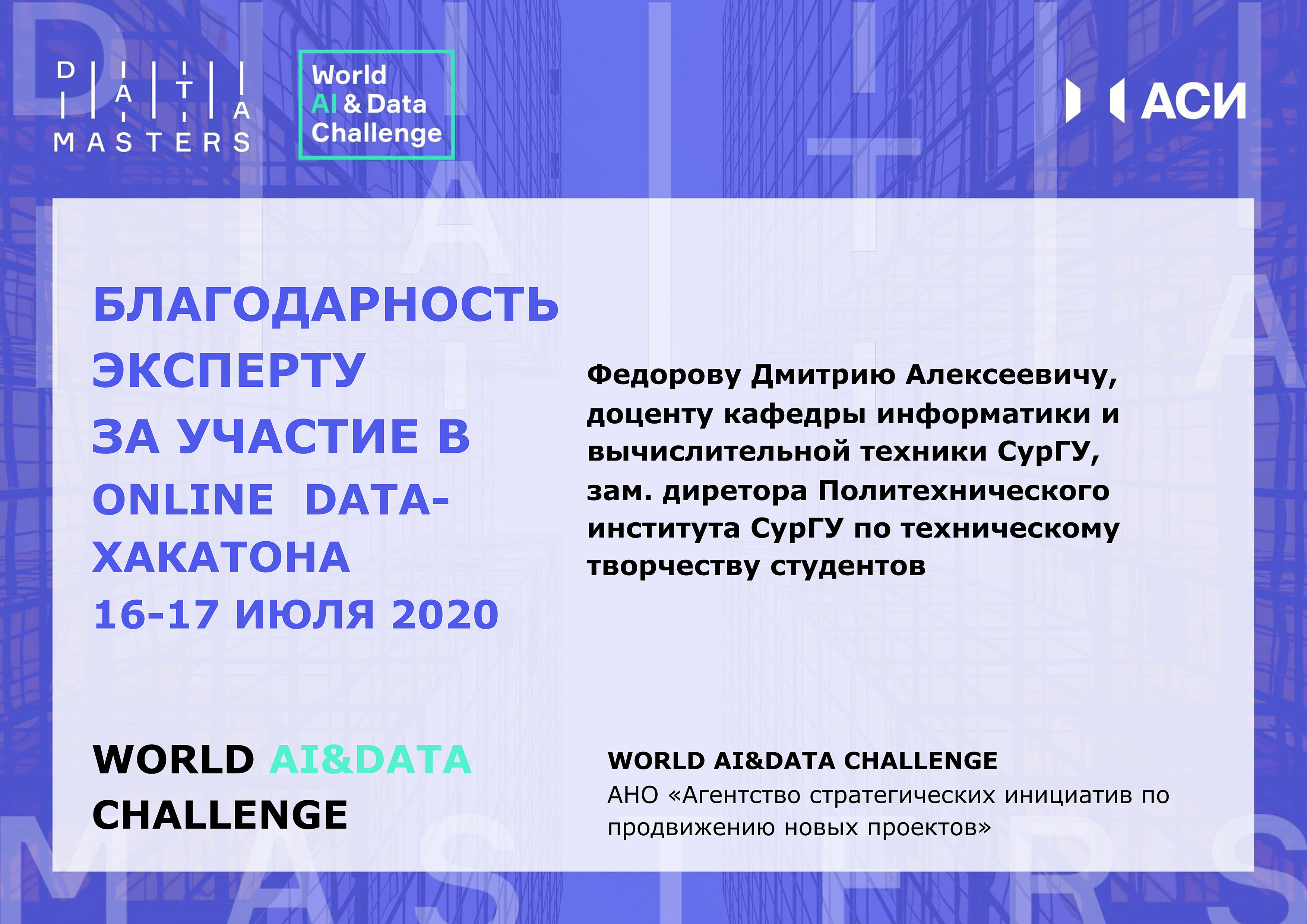 В четверг, 16 июля, при поддержке Сургутского государственного университета на онлайн-площадке «Точки кипения» состоялся масштабный онлайн data-хакатон, который проходит в рамках второго этапа международного проекта Агентства стратегических инициатив (АСИ) World AI&Data Challenge для IT- и data-специалистов, студентов и представителей IT-компаний. Проект в формате data-хакатона реализуется в контексте инициативы «Цифровые решения для регионов». Лучшие разработки в области искусственного интеллекта будут внедряться по всей России и даже тиражироваться в другие страны!