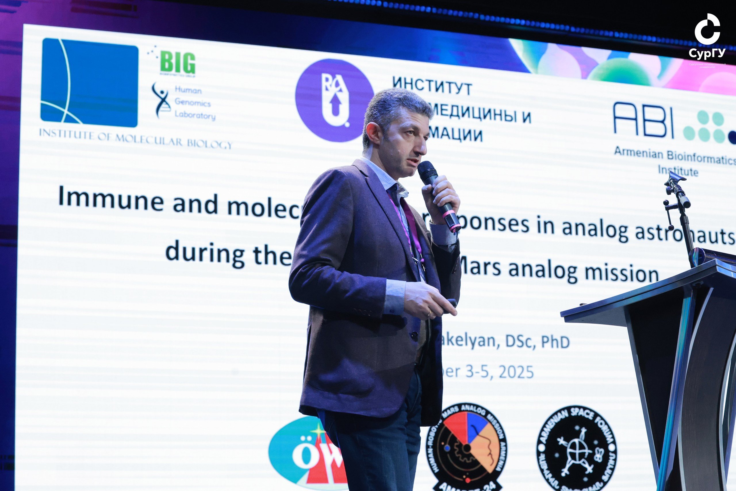Темой следующего доклада директора Института молекулярной биологии Национальной академии наук Республики Армения Арсена Аракеляна стало исследование биологических изменений людей в рамках аналоговой миссии, имитирующей условия планетарной миссии на Марсе под названием AMADEE-24, организованной Австрийским космическим форумом и Армянским космическим агентством. Пять аналоговых астронавтов на протяжении двух недель проживали в изоляции на «армянском Марсе»: проводили геохимический анализ почвы, брали пробы, ходили в скафандре.