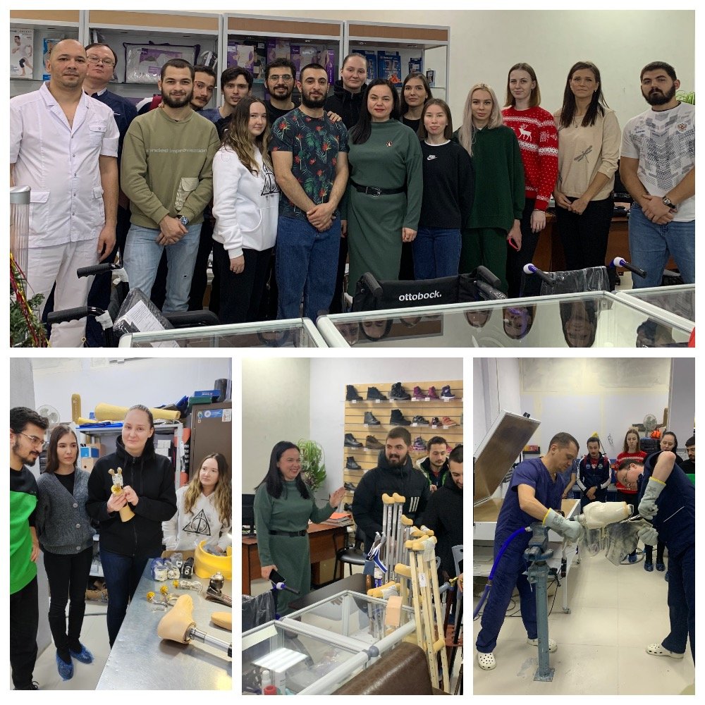 20 декабря 2022 г. специалисты центра познакомили студентов с типами современных протезов: механическими (тяговыми); бионическими (миоэлектрическими); гибридными (комбинированными), а также с производством индивидуальных изделий, специальных протезов для конкретных видов деятельности: лечебно-тренировочные, функционально-косметические, рабочие, протезы для купания для людей с ампутированными конечностями, врожденными особенностями развития.